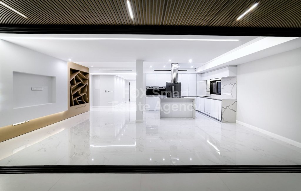 The apartment offers bespoke design, crafted with high end finishing such as marble, granite stones, real wood floors, open plan design kitchen and living-room. Includes a guest w/c, 1 master bedroom with en-suite bathroom and a large glazed walk-in closet, 2 additional double bedrooms with en-suite bathrooms, and a large outdoor veranda, accessed from the living room area via fully folding glazed doors.