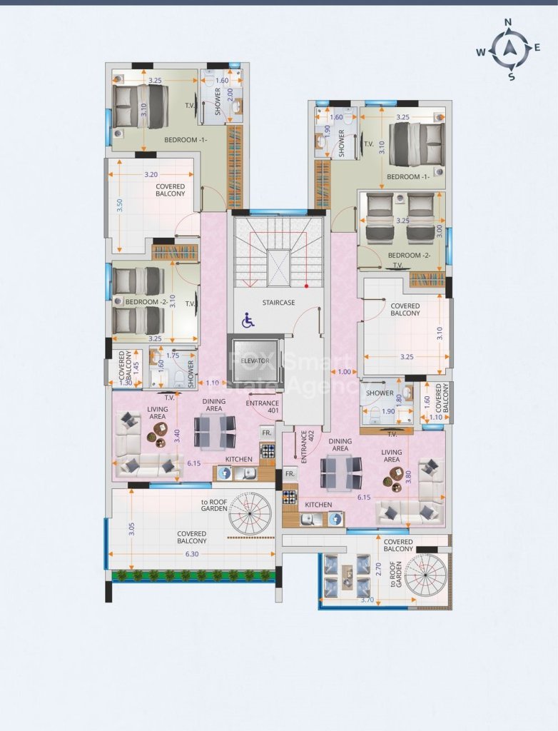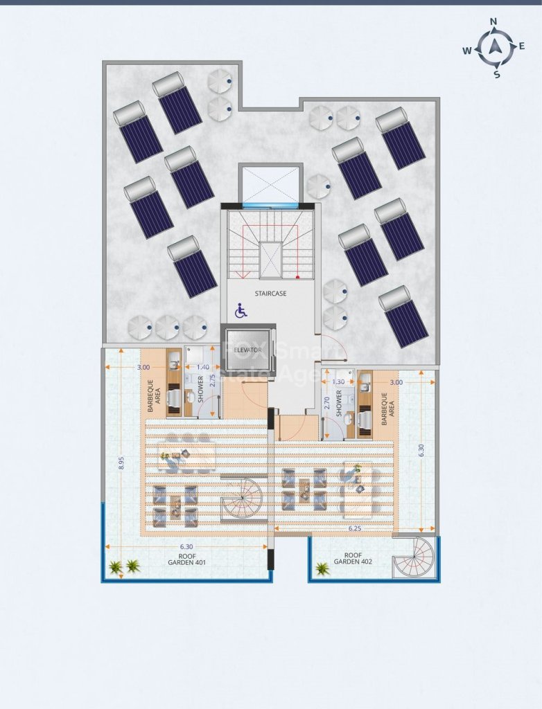 Top floor two bedroom apartment with a roof garden for sale, close to amenities on a quiet residential area. Open plan living and kitchen area, two bedrooms, two bathrooms, large covered veranda, covered parking space and storage room. On the roof garden there is a small room. The project will be delivered by the end of 2025.