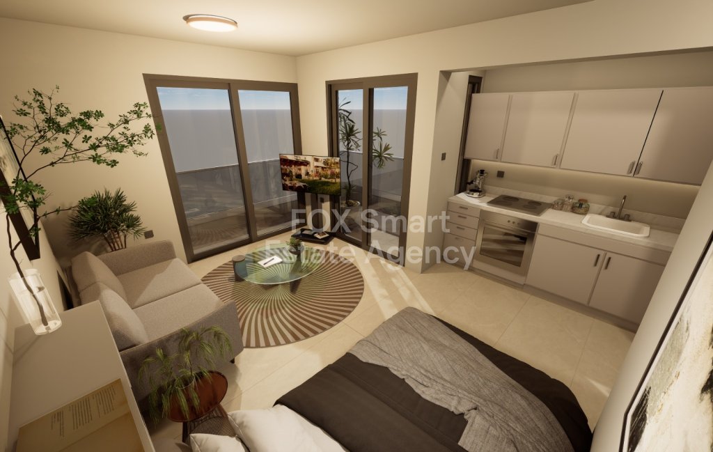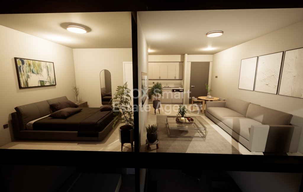 This modern studio apartment in the heart of Larnaca offers a bright, open-plan living space combining the living, sleeping, and kitchen areas in a functional and stylish layout.