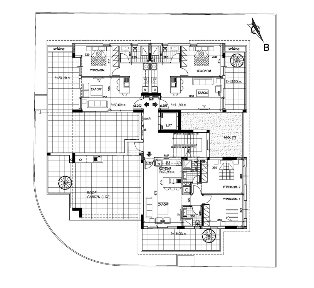 • Apartment 201, positioned on the second floor, boasts an internal area of 76.9sqm along with 18.6sqm of covered verandas and additional huge roof garden of 102sqm.