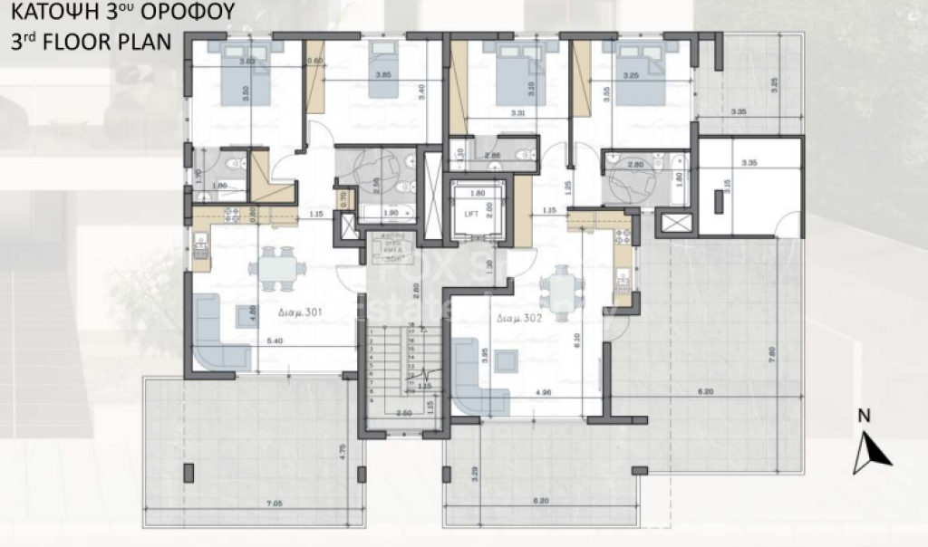 • The apartment (302) is situated on the third / top floor with internal area of 80.50sq.m, covered and uncovered verandas of 74sqm in total.