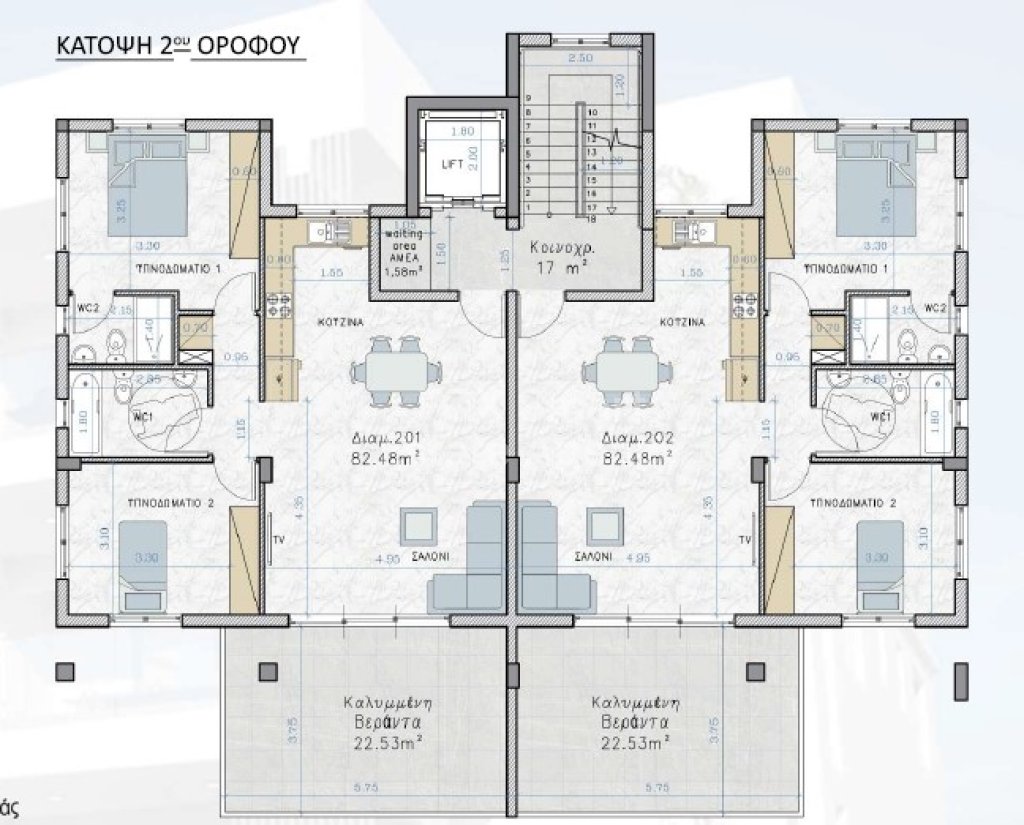 • The apartment (202) is situated on the second floor with internal area of 82sq.m. plus covered veranda of 22.6sqm.