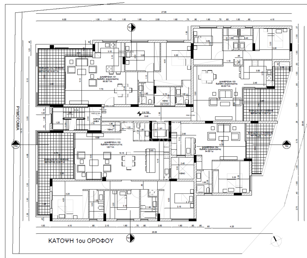 • Apartment 104 on the first floor with an internal area of 54sqm and covered verandas of 12sqm.