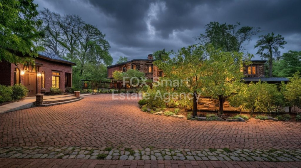 The estate extends over two generous plots and is surrounded by beautifully landscaped gardens that blend paved courtyards with lush ornamental greenery.