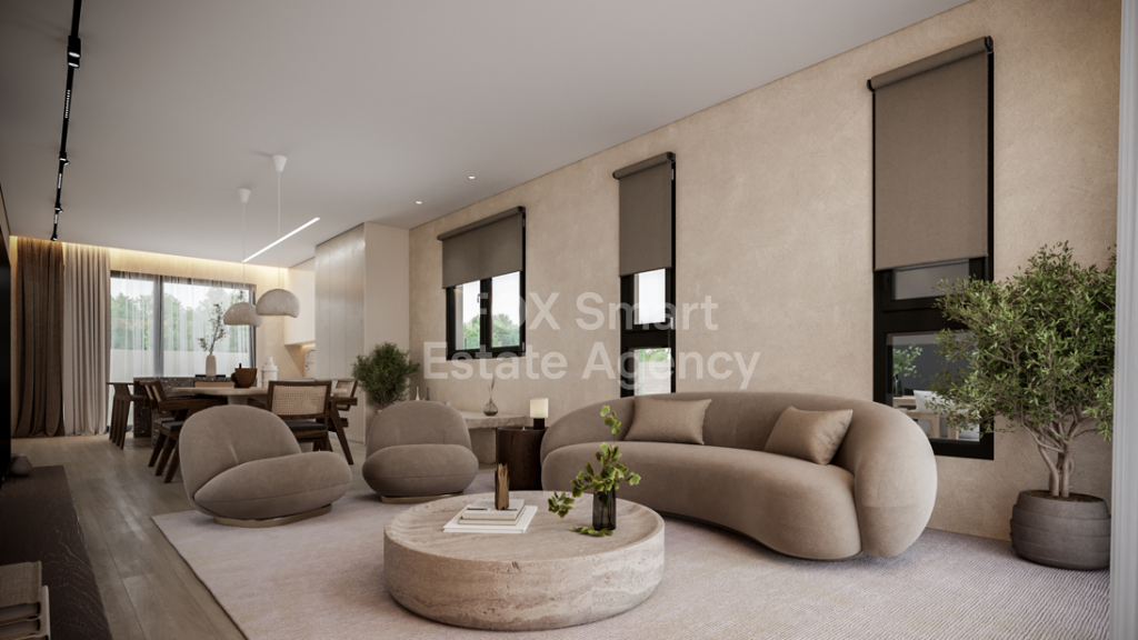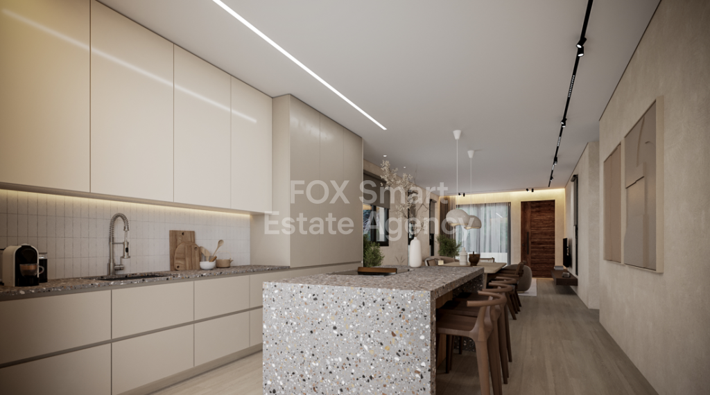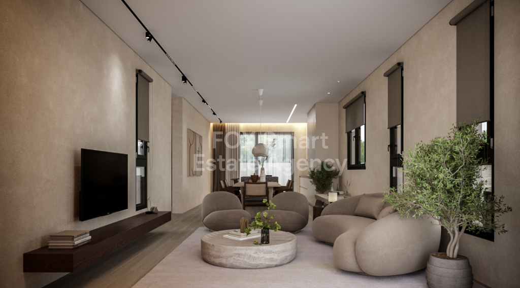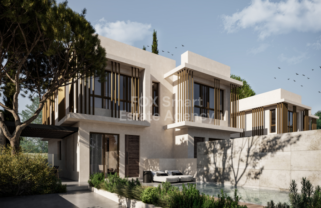 Three bedroom semi-detached house with a private swimming pool, for sale in Protaras area, minutes drive from the beach. Modern interior, open living area and kitchen, three bedrooms, three bathrooms, private parking and garden. The houses are in a gated community and will be delivered by September of 2026.