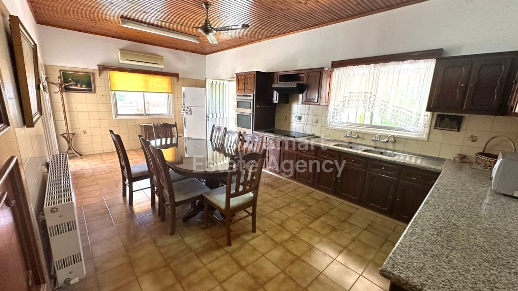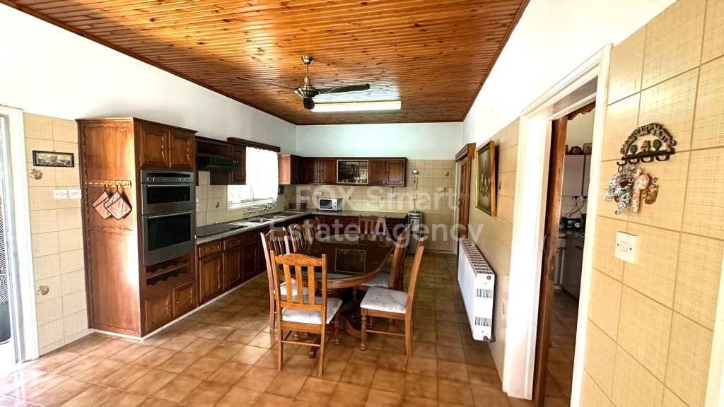 Three bedroom bungalow for sale in a very good location close to schools, supermarket, very easy highway access, and 3 munites with a car from the middle of the village. The house is one level, has a spacious living and dinning room, separate kitchen, kitchenette, three bedrooms, one hole bathroom and a guest w/c. The house has heating, aircontition units, and a closed garage space for one car. The house has a big yard and a nice covered verandas.