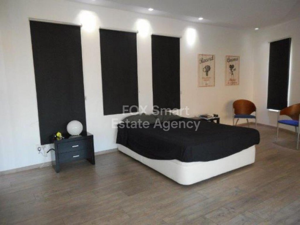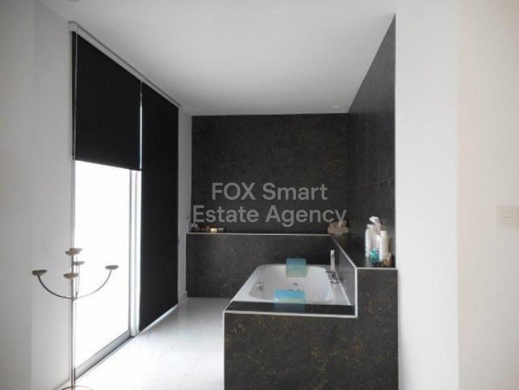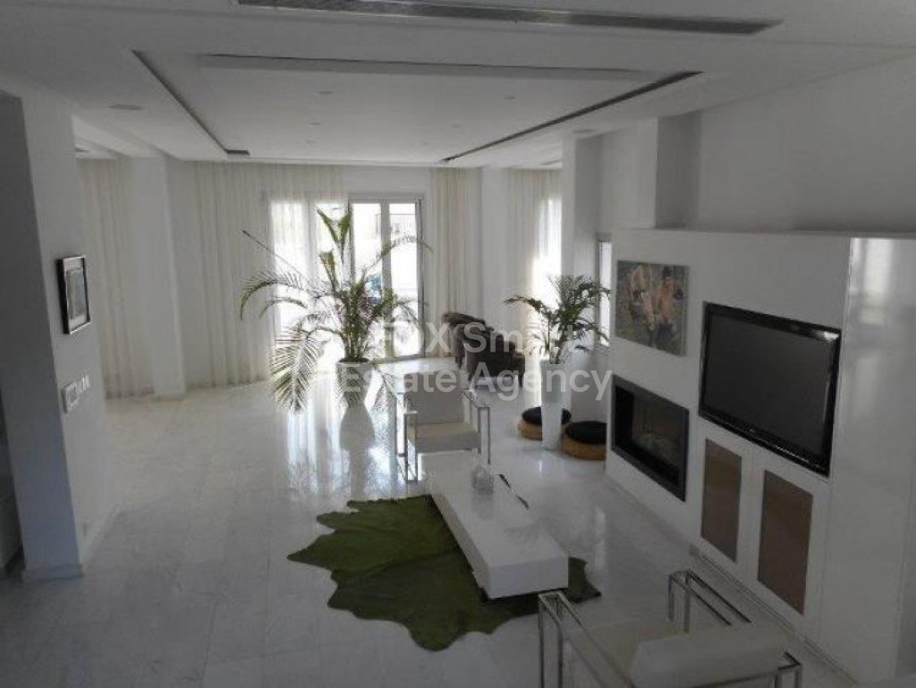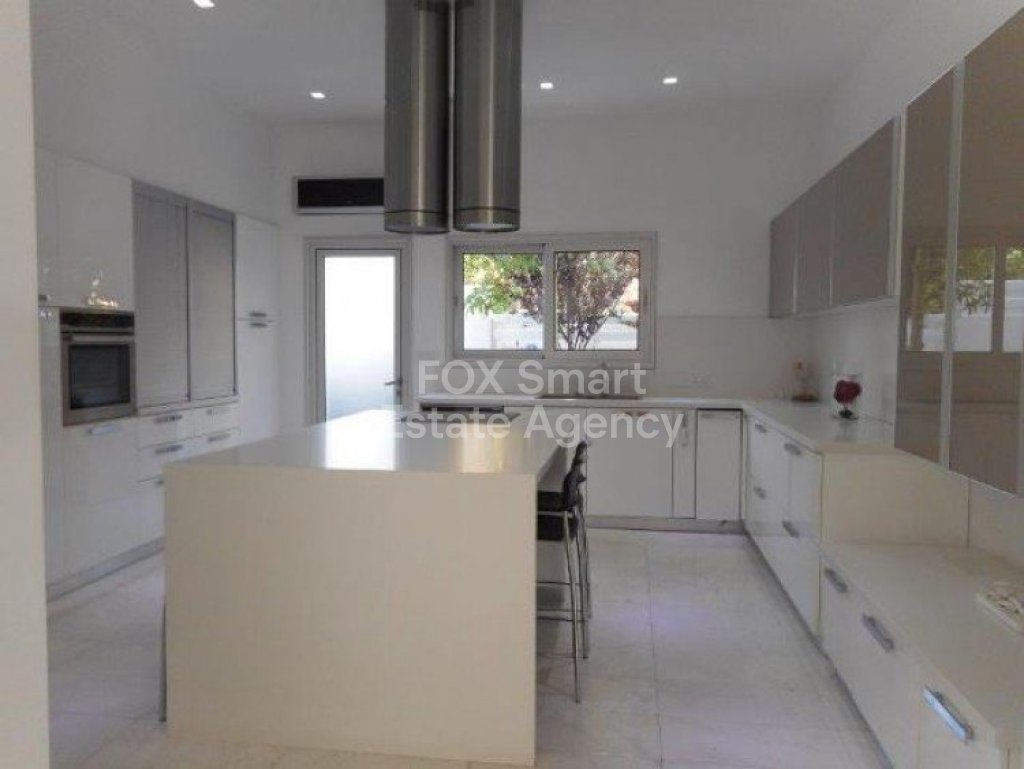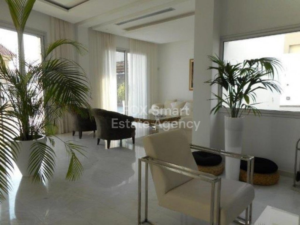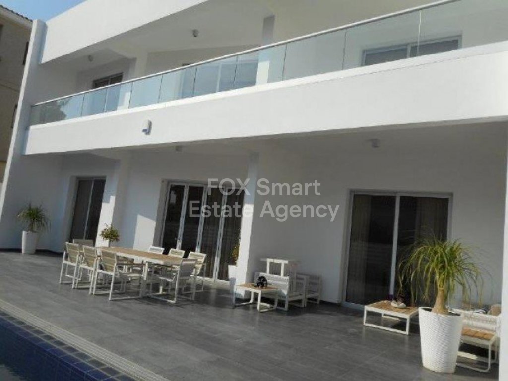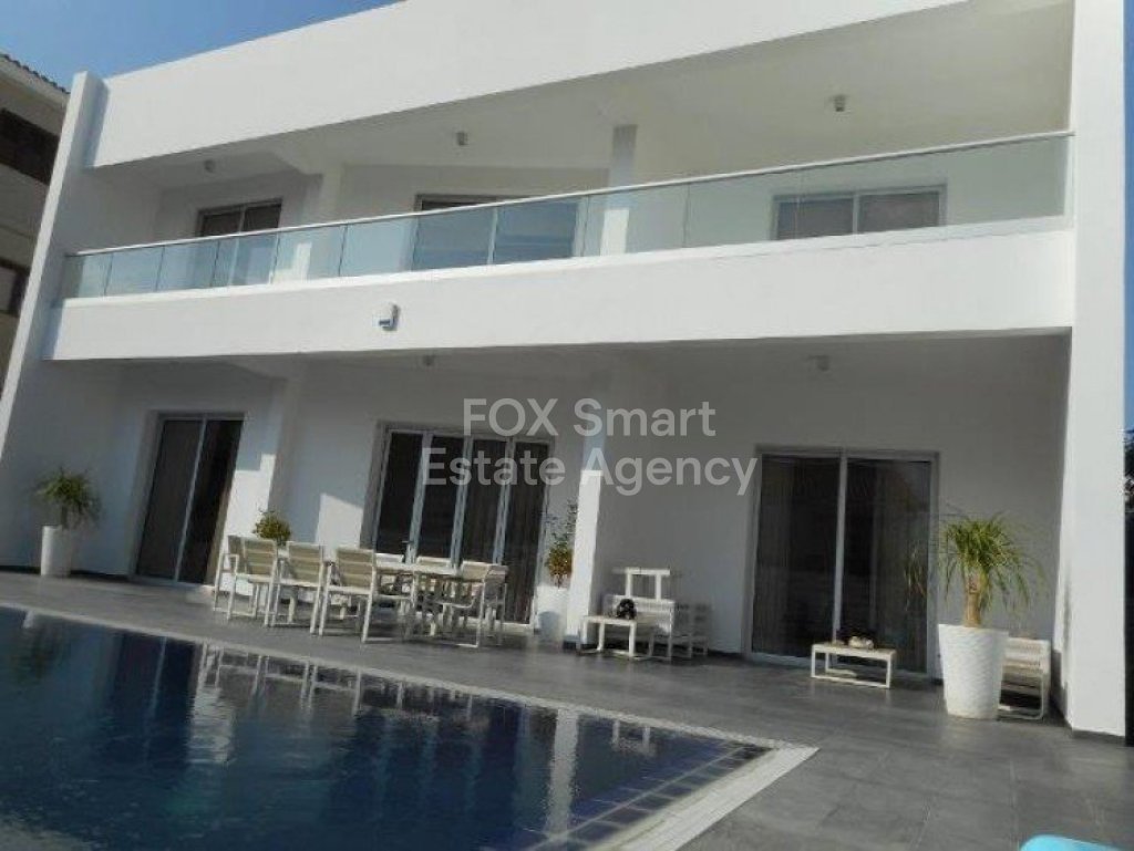 A luxury resale 5 bedroom villa in the sought after location of Agios Athanasios. No expense has been spared in making this property a beautiful home. Plot size 711m² and total covered area 475m², built in 2012. Double entry with hall, sitting/lounge area with home cinema, a separate office on the same level. Steps lead down to guest wc with shower and a further bedroom (5th bedroom). Fully equipped kitchen area, with breakfast/diner, sitting/dining/tv area with built in fireplace, Large patio doors lead to the gardens and swimming pool area. Four bedrooms on the upper level, master en suite with Jacuzzi and walk-in wardrobe, a further bedroom en suite and main bathroom, kitchenette. Central heating, a/c built in , central sound system, alarm, double glazed windows, electric double garage, over swimming pool 4x12, with outside shower/wc and storage area. Large storage areas in the semi basement.