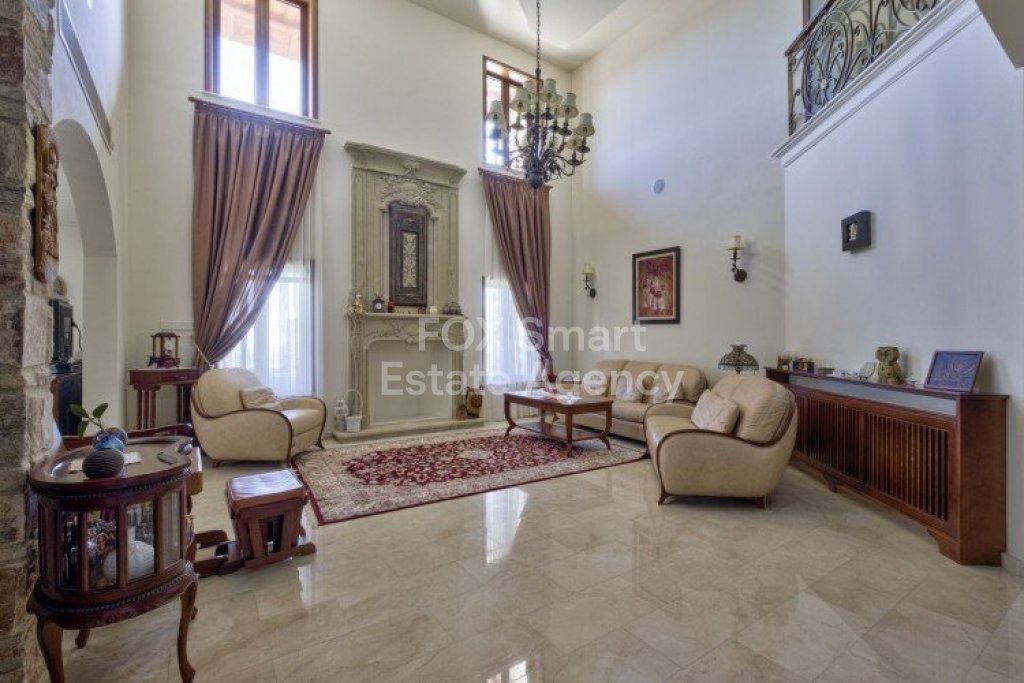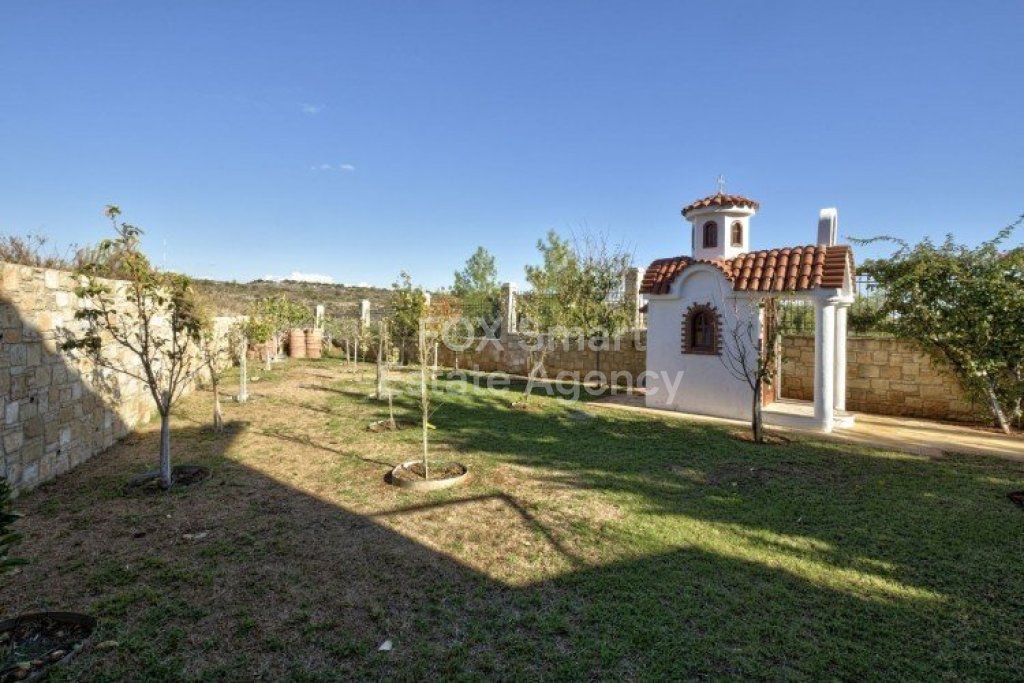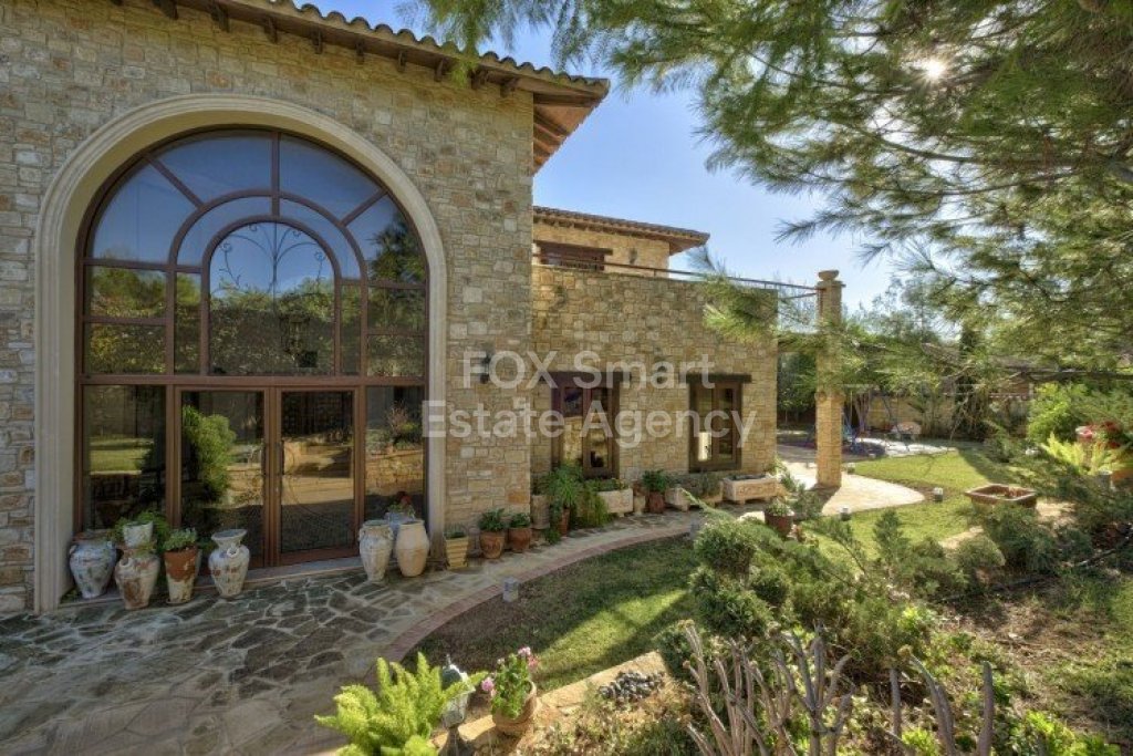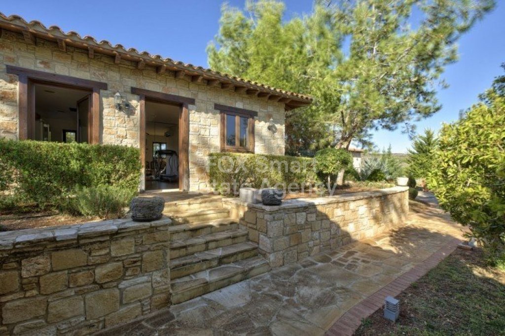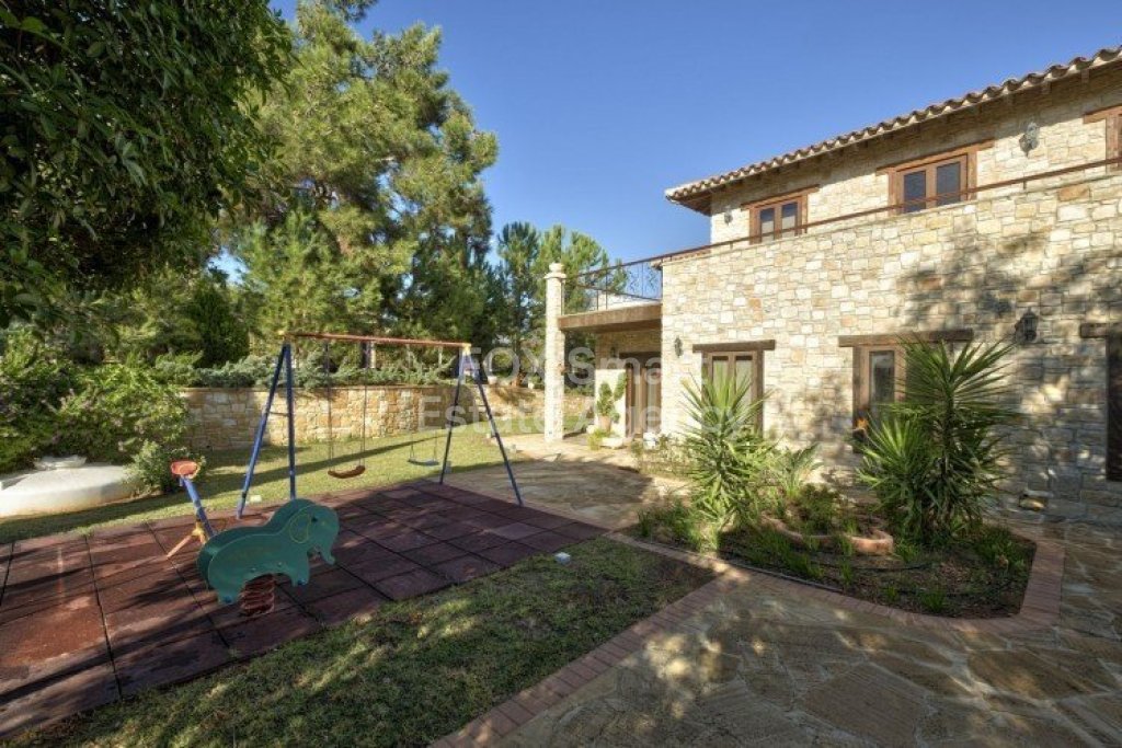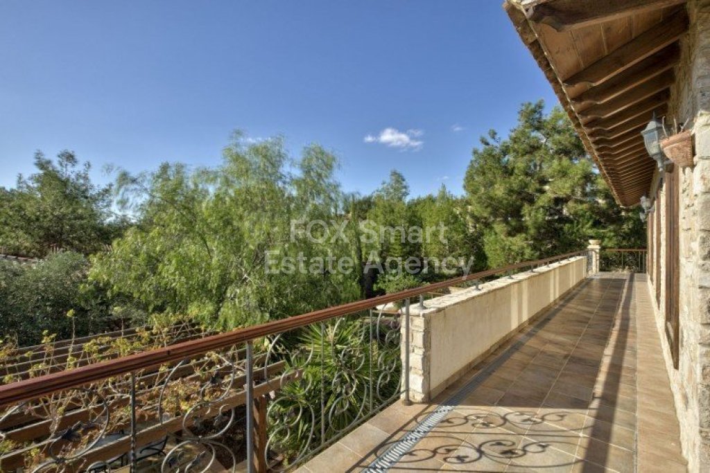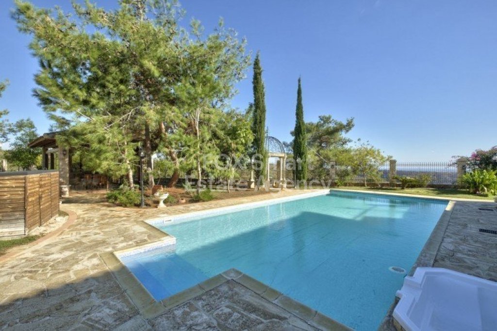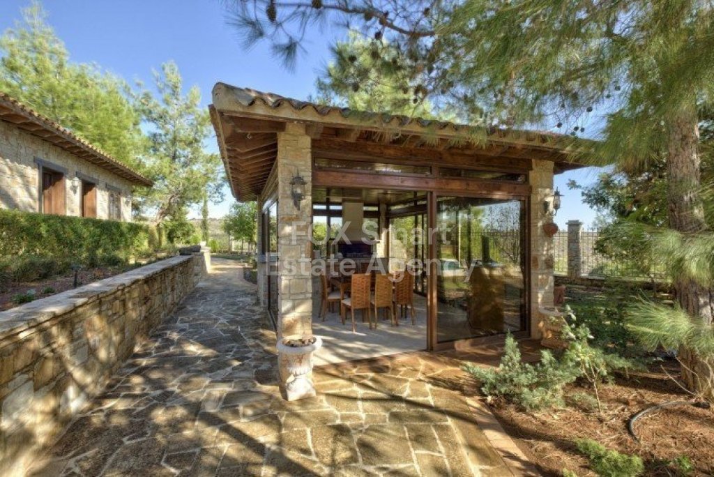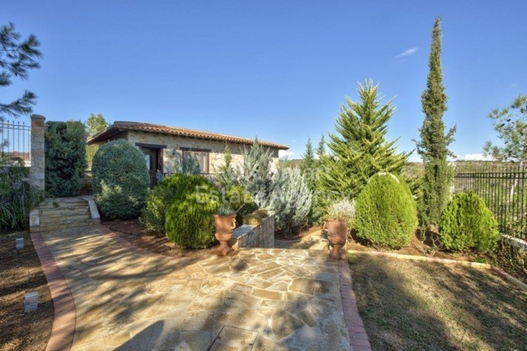 Main House: 440m2,Guest House: 100m2 2 studios 50m² x2, Plot: 3911m2 House consisting of: A. Ground floor: kitchen - family room, utility room, living room dining room, entrance hall, a master suite with separate dressing area and en-suite bathroom, guest’s toilet and study. B. 1st Floor with a landing hall, two bedrooms both en suite, large balconies all around the house. 5. Stone wall boundary with iron bars and 2.20m high electric gate remotely controlled entrance door - video/audio link to the building. 6. Preparation for irrigation system with a complete water system connected to own water well. 7. Preparation for satellite and ADSL / Broad band connections. 8. Solar and electric water heating system. 9. A pergola 3m x 6m with lighting. 10. 250m² of Crazy paving. 11. Preparation for 18 perimeter lights (lighting fixtures for in and outside the house will be supplied by the Purchaser). 12. Tiled roof bar with BBQ. 13. 4 Garden water/hose connections to own water source 14. Covered sitting area with fire place 15. 100m2 guesthouse with two en suite bedroom and kitchenette 16. Alarm System 17. Reclaimed roof tiles on top of specially imported corrugated cement based sheets 2. One single stone built garage 4 x 6 m with remote control door. 3. 20m2 outhouse with sauna, toilet, shower and changing room 4. Swimming pool 6m x 12m (maximum depth 1.6 meter) with built in spa. Double glazed aluminum windows, Designer kitchen , Parquet wood in bedrooms, Ceramic tiles or marble downstairs, Entertainment and Energy management System,. Central heating Air conditioning.