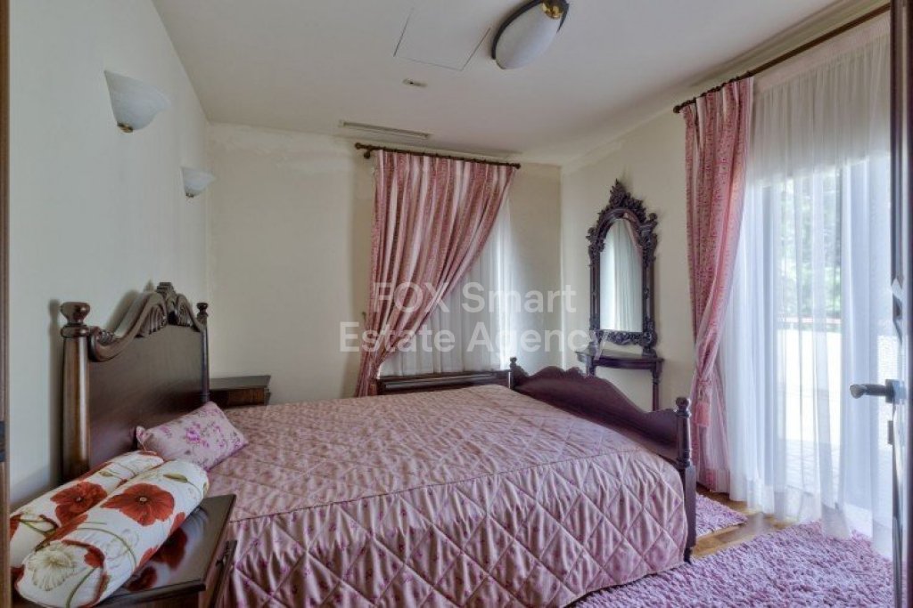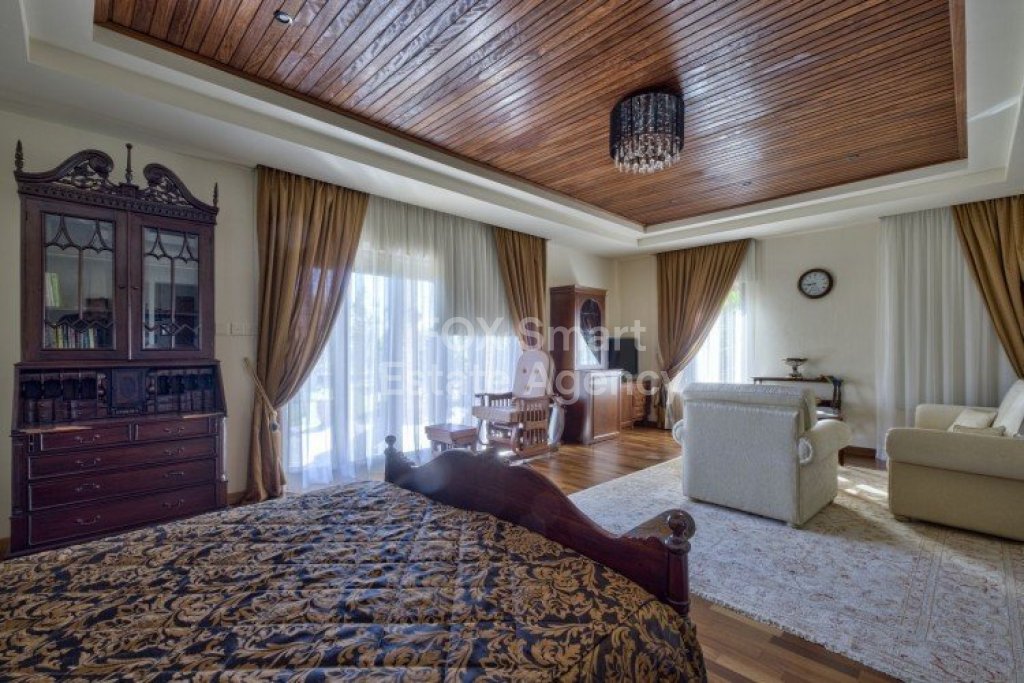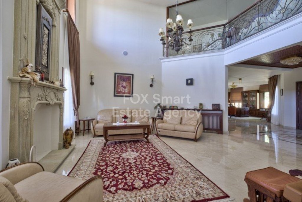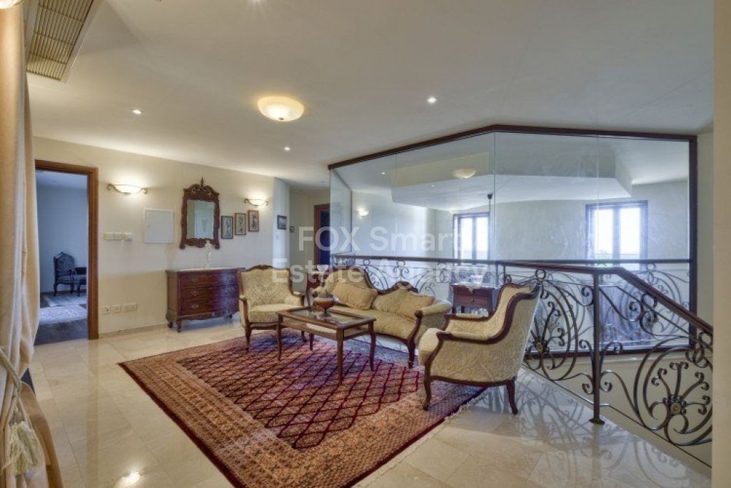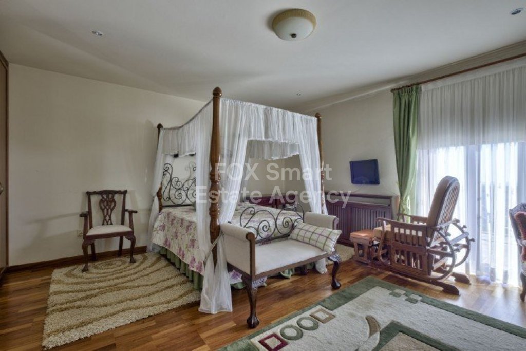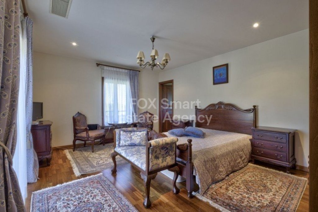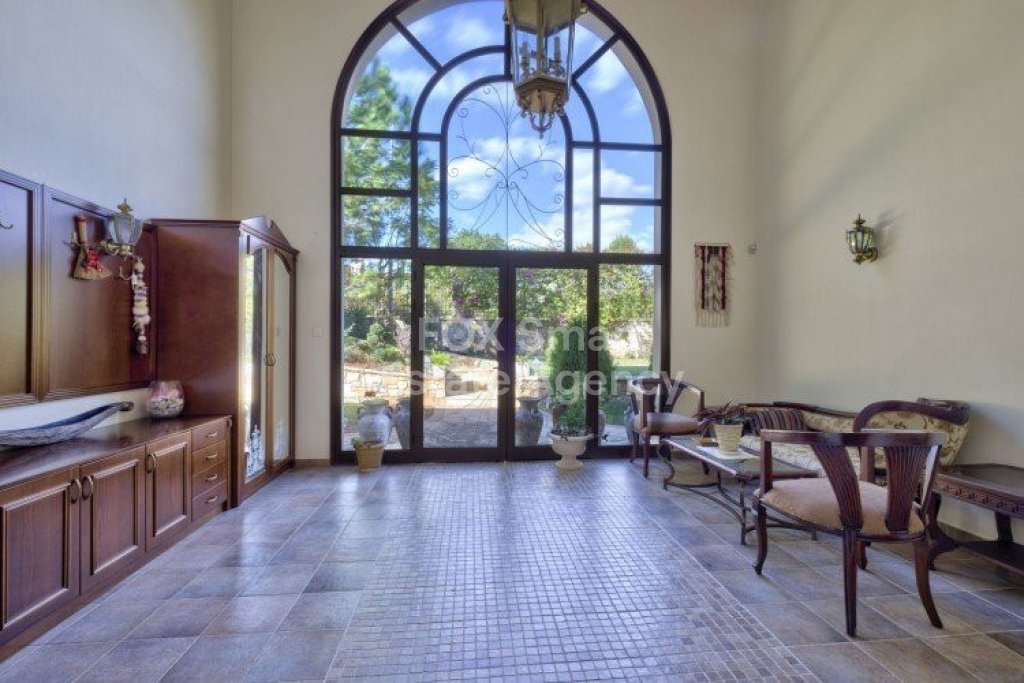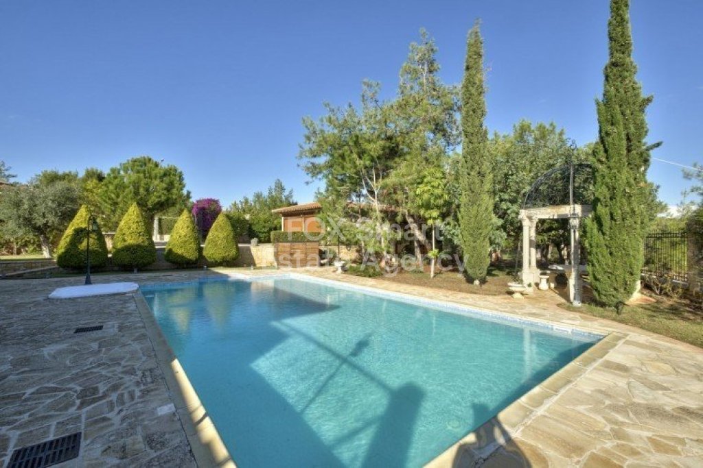 Main House: 440m2,Guest House: 100m2 2 studios 50m² x2, Plot: 3911m2 House consisting of: A. Ground floor: kitchen - family room, utility room, living room dining room, entrance hall, a master suite with separate dressing area and en-suite bathroom, guest’s toilet and study. B. 1st Floor with a landing hall, two bedrooms both en suite, large balconies all around the house. 5. Stone wall boundary with iron bars and 2.20m high electric gate remotely controlled entrance door - video/audio link to the building. 6. Preparation for irrigation system with a complete water system connected to own water well. 7. Preparation for satellite and ADSL / Broad band connections. 8. Solar and electric water heating system. 9. A pergola 3m x 6m with lighting. 10. 250m² of Crazy paving. 11. Preparation for 18 perimeter lights (lighting fixtures for in and outside the house will be supplied by the Purchaser). 12. Tiled roof bar with BBQ. 13. 4 Garden water/hose connections to own water source 14. Covered sitting area with fire place 15. 100m2 guesthouse with two en suite bedroom and kitchenette 16. Alarm System 17. Reclaimed roof tiles on top of specially imported corrugated cement based sheets 2. One single stone built garage 4 x 6 m with remote control door. 3. 20m2 outhouse with sauna, toilet, shower and changing room 4. Swimming pool 6m x 12m (maximum depth 1.6 meter) with built in spa. Double glazed aluminum windows, Designer kitchen , Parquet wood in bedrooms, Ceramic tiles or marble downstairs, Entertainment and Energy management System,. Central heating Air conditioning.