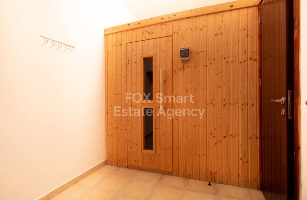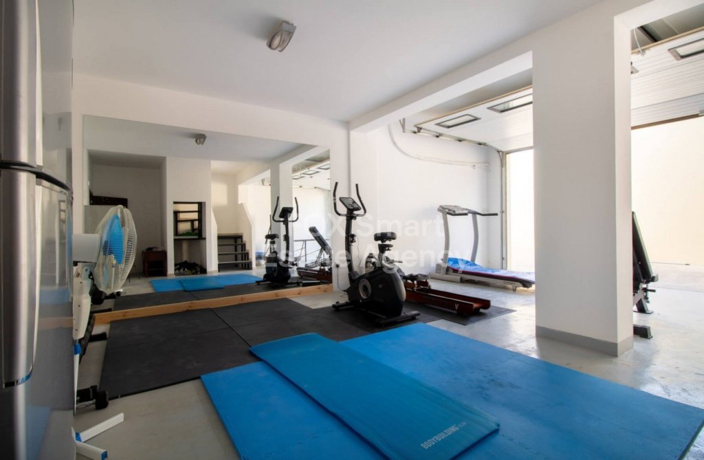 Walking down the staircase to the lower level, one will find a spacious exercising area with gym equipment, bathroom and sauna.