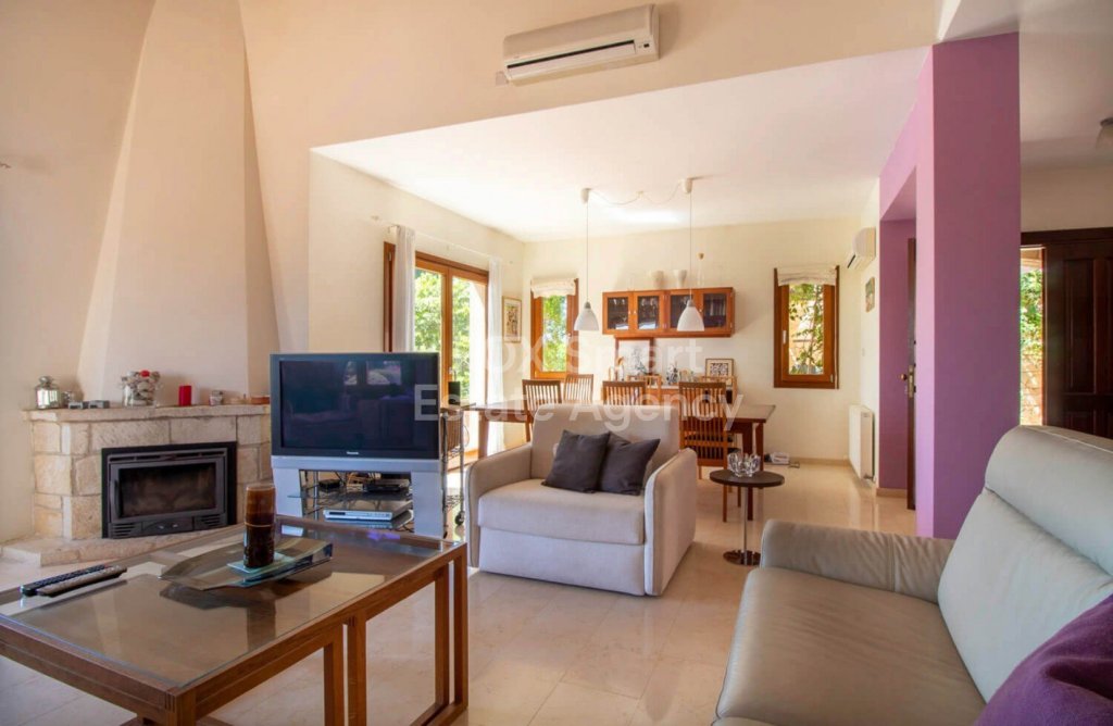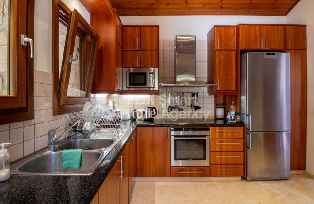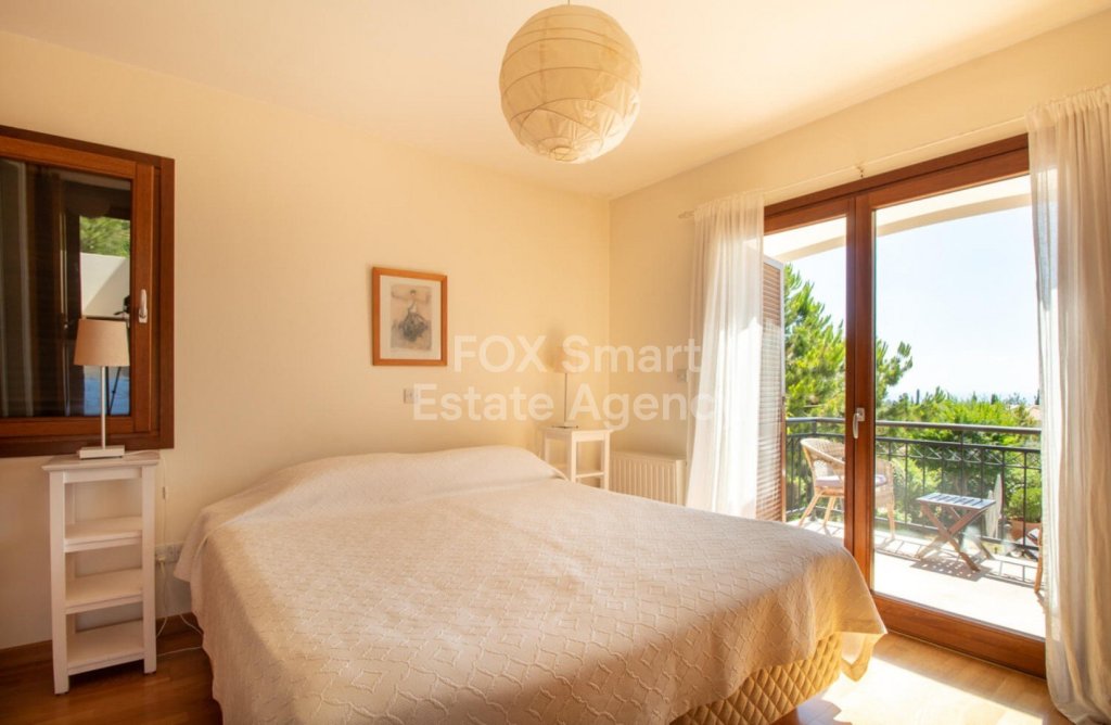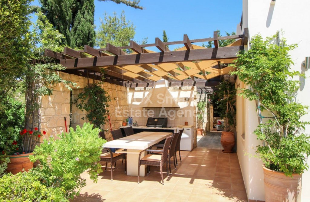 Stepping out of the living and dining rooms through the wonderful French doors, one will notice the gardens below that reflect traditional Cypriot landscaping, a very large swimming pool and a very spacious terrace and BBQ area to accommodate large gatherings when socializing. The garden offers mature trees and aromatic plants and shrubs.