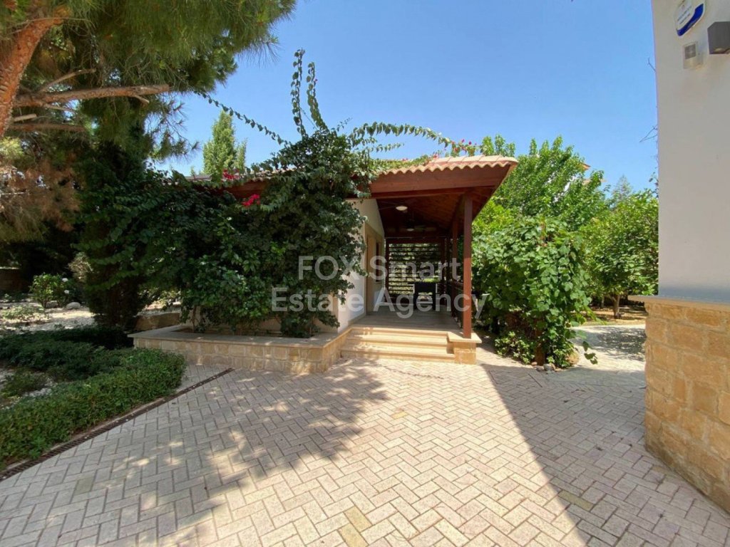 Stepping outside through the elegant French doors, you are greeted by expansive outdoor spaces designed for relaxation and entertaining. The landscaped garden blends traditional Cypriot elements with mature greenery and countless fruit trees. A very large overflow swimming pool, extensive terraces, and a spacious covered BBQ area make this villa perfect for gatherings and outdoor living.