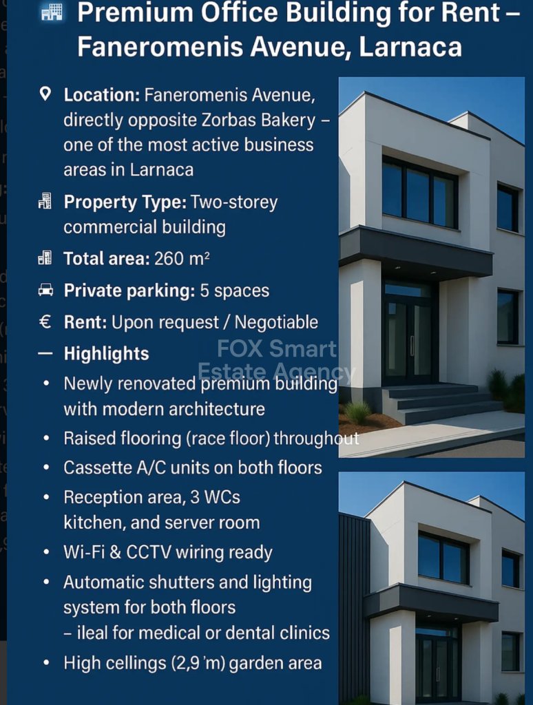 A prime commercial property is available for rent in one of Larnaca’s most prestigious locations – Faneromenis Avenue. Currently undergoing full renovation, the property will soon offer modern, high-standard facilities designed to meet the needs of today’s professionals.