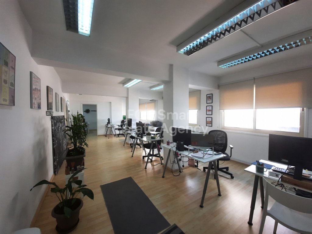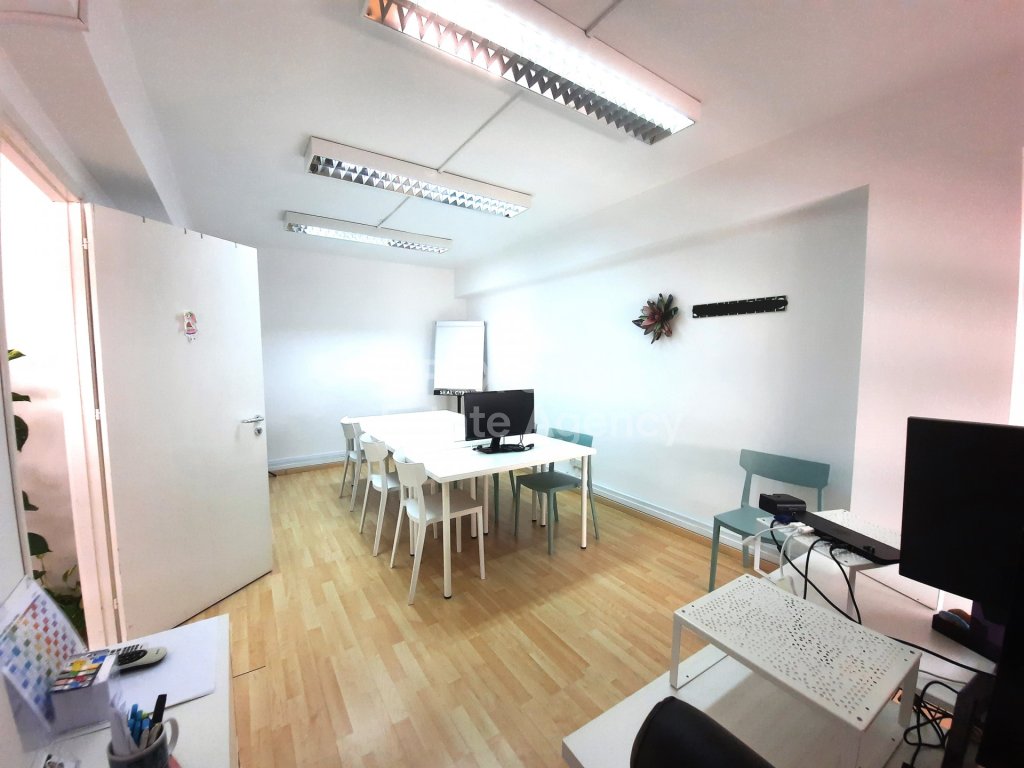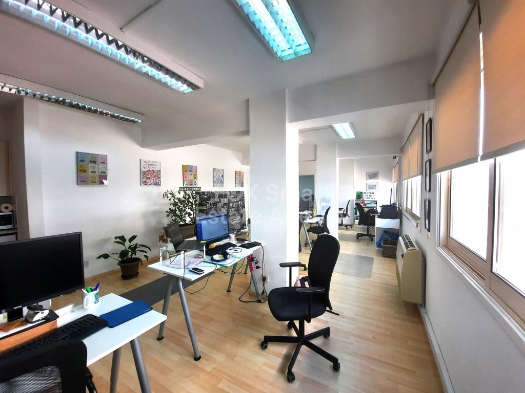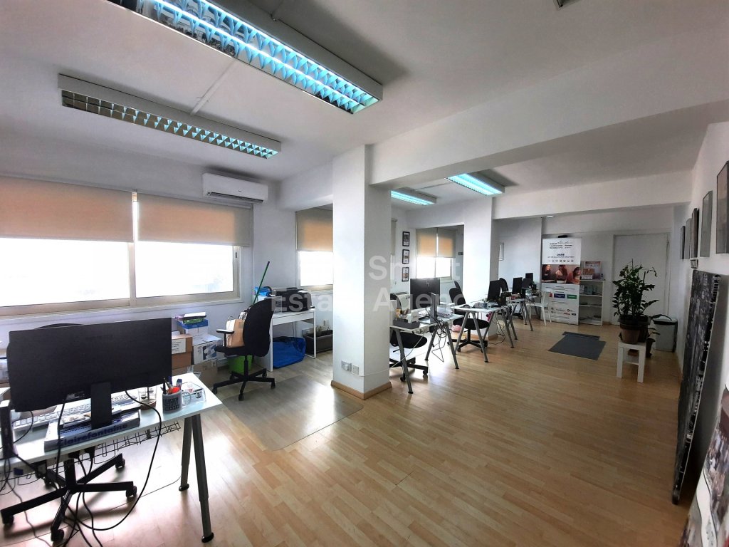 Modern Office 82sqm in Platy Aglantzia , Nicosia Location This office space is in Platy Aglantzia. Next to Kyrenias Avenues and within walking distance to all services. Platy Aglantzia is a privileged area of Nicosia with immediate access to the city center. Easy access is also available towards the Nicosia Limassol highway. External Features The building is located next Kyrenias Avenue. It is a commercial building of offices and shops on the ground floor. The building is 24 years old, and its external looks are modern and well maintained. Internal Characteristics The office is situated on the first floor with internal area of 82sqm partitioned in two spaces. It consists of a big open plan space, a separate conference/meetings space, a w/c and a storage space. Double glazed windows and roller blinds. A/C units covering all spaces. Covered parking for 2 cars.